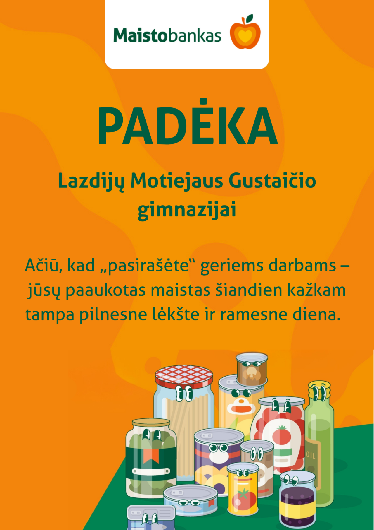 Lazdijų Motiejaus Gustaičio gimnazijos bendruomenė dar kartą įrodė, kad gerumas, bendrystė ir socialinė atsakomybė yra svarbios mūsų vertybės. Kovo 16–27 dienomis gimnazija aktyviai įsitraukė į Mokyklų „Maisto banko“ akciją ir „pasirašė“ geriems darbams.