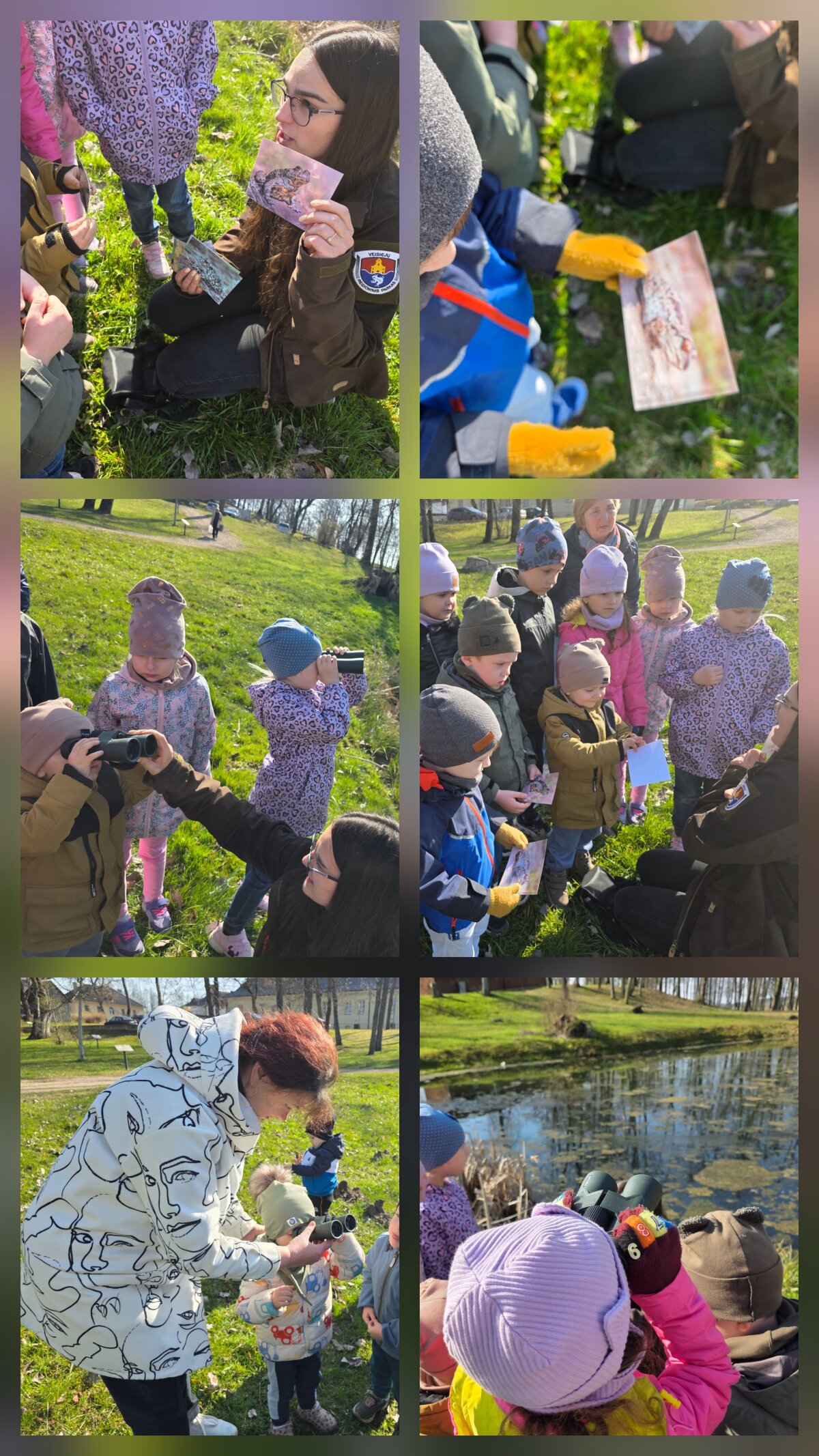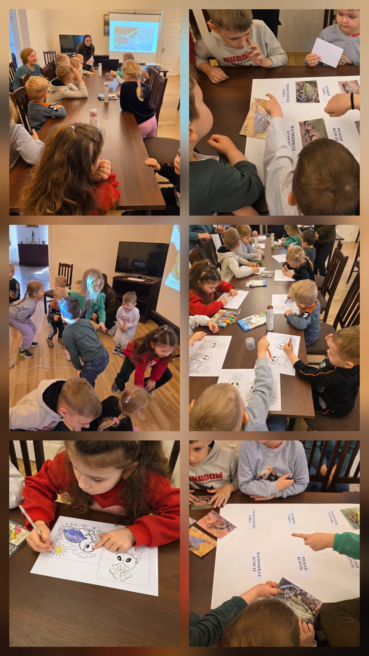 Edukaciją "Medvarliukas - regionino parko pasididžiavimas" vedė Veisiejų regioninio parko lankytojų centro administratorė Miglė. Ji labai įdomiai vaikus supažindino su medvarle: vaizdžiai ją apibūdino, parodė gyvenamą vietą, pasiūlė vaikams pro žiūronus apžvelgti parke gausiai įsikūrusius kovus. Lankytojų centre vaikai aptarė varlių kūno dalis, kaip ir kuo jos minta, klausėsi kelių rušių varlių kurkimo, stebėjo, kaip jos plaukioja, įsirausia į smėlį, atrinko jų rūšis nuotraukose, ieškojo žolėje pasislėpusios varlytės, žaidė žaidimą imituodami varlytes, spalvino varlyčių paveiksliukus. Edukacijos pabaigoje vaikai smalsiai apžiūrėjo informacinį lankytojų centro kambarį.