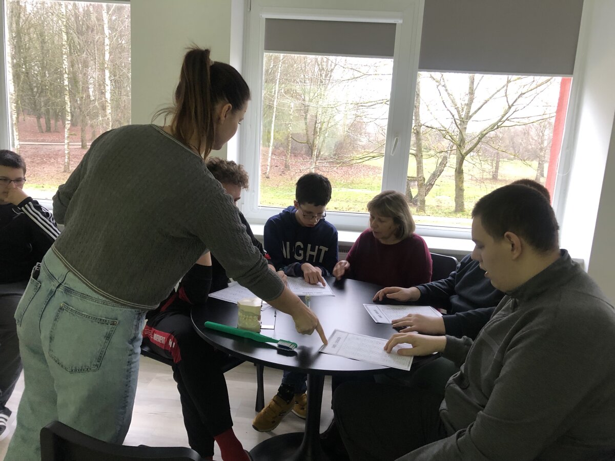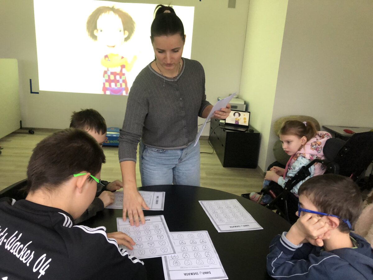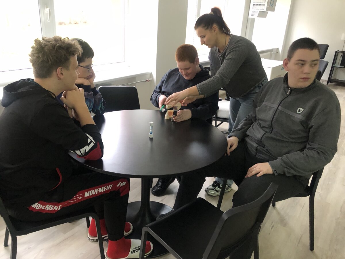 Gruodžio 8 d. specialiųjų klasių mokiniai dalyvavo pamokėlėje „Laimingi dantys, laimingas aš“, kurią vedė gimnazijos visuomenės sveikatos priežiūros specialistė A. Kubiliene. Pamokėlės tikslas - supažindinti mokinius su burnos higienos svarba ir formuoti teisingus dantų priežiūros įgūdžius. Pamoka prasidėjo pokalbiu apie tai, kaip svarbu prižiūrėti dantukus, kokią įtaką jie turi sveikatai ir kaip juos tinkamai valyti. Vaikai aktyviai dalyvavo diskusijoje: kalbėjosi, kam žmogui reikalingi dantys ir kokias funkcijas jie atlieka. Pamokos metu buvo naudojamas dantų modelis, kuris padėjo vaikams aiškiau suprasti, kaip taisyklingai valyti dantukus. Jie galėjo praktiškai valyti dantis, naudodami didelį šepetuką. Tai suteikė daug džiaugsmo ir smagaus juoko. Vaikai atliko įvairias užduotis, kurios suteikė vaikams ne tik naujų žinių, bet ir paskatino rūpintis savo burnos higiena.