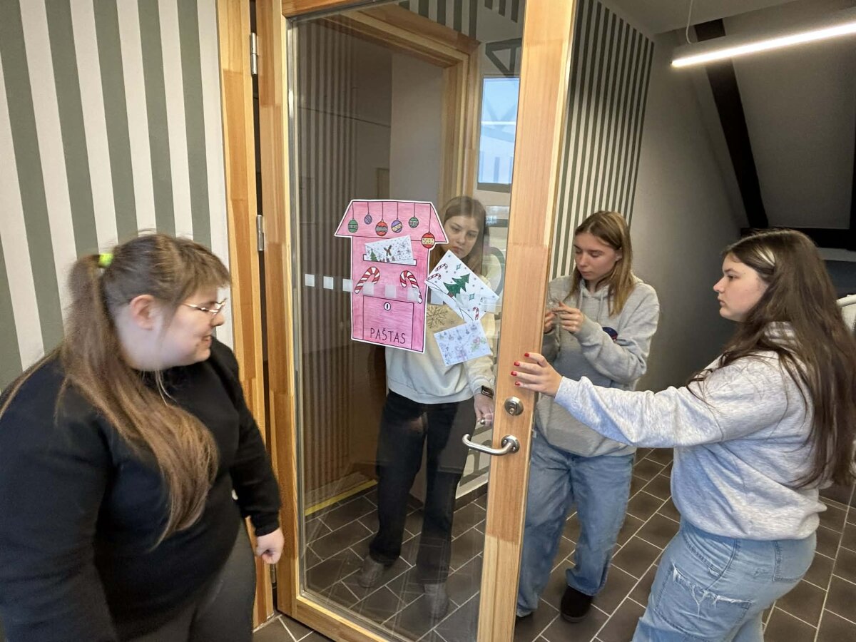 Laukiant gražiausių metų švenčių, kai visa gimnazija puošiasi spalvingomis dekoracijomis, gruodžio 3 d. neformaliojo švietimo būrelio „Padėk ir gauk pagalbą“ mokinės dalyvavo užsiėmime „Laiškas Kalėdų seneliui“, kurio metu dekoravo laiškus ir jais papuošė savo erdvės duris, taip prisijungdamos prie gimnazijoje vykstančios akcijos, kurios metu kiekviena klasė dekoruoja savo kabineto duris. Šios gražios bendros veiklos ir pamažu auganti draugystė, suteikia jaukumo ir šilumos, ne tik prieš artėjančias šventes, bet ir kiekvieno bendro užsiėmimo metu. Manome, kad mums pavyko puikiai.