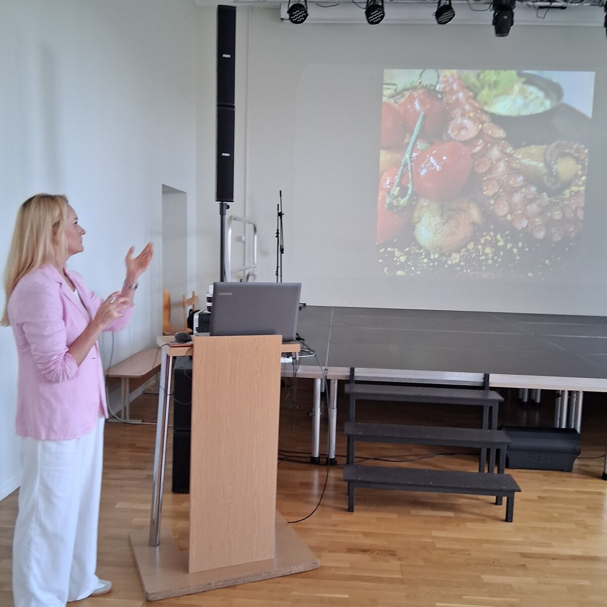 Pamokos metu sužinojome visą maisto gamybos procesą – nuo tinkamo produktų pasirinkimo ir paruošimo iki estetiško bei sveiko maisto patiekimo klientui. Viešnia pabrėžė, kad maistas turi būti ne tik gražiai pateiktas, bet ir kokybiškas bei naudingas sveikatai. Ji akcentavo atsakingą požiūrį į ingredientus ir mitybą.