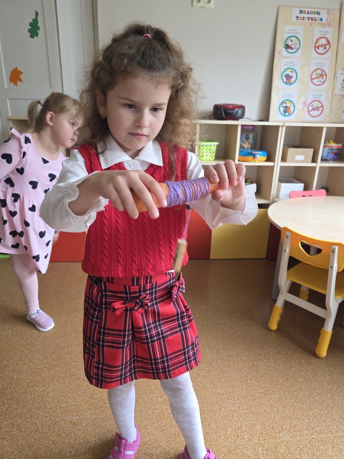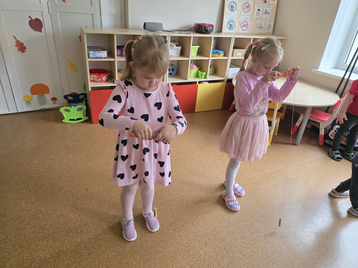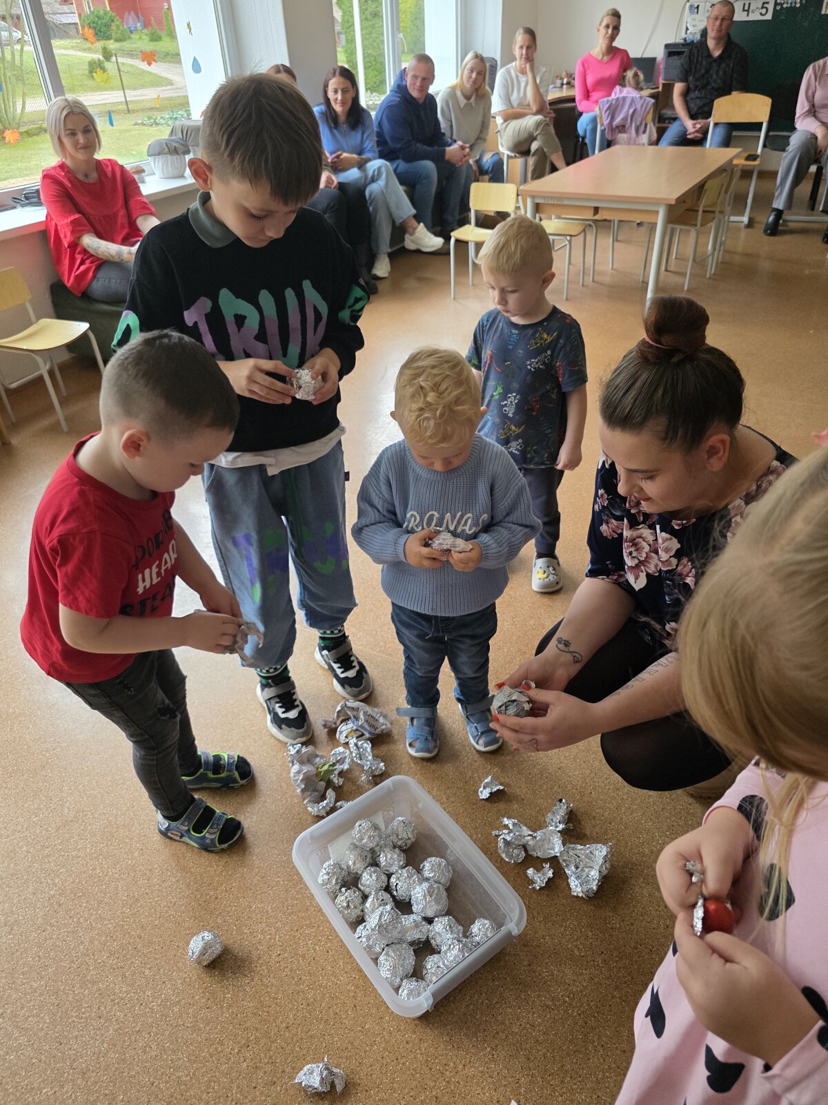 Vaikai padeklamavo eilėraštį "Už lango Rudenėlis", dainavo daineles "Riešutauti aš einu", 'Močiutės pyragas", "Obelėlė", šoko ratelius "Voro staltiesėlė", "Lapai du", "Rudeninių lapų šokis", atliko skaičiavino, pojūčių lavinimo judrumo, pirštelių miklumo reikalaujančias užduotis. Į veiklas noriai įsitraukė ir tėveliai.